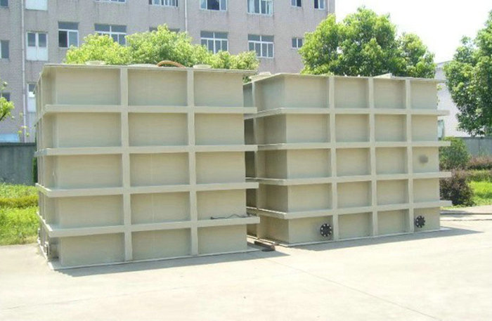 一種工業廢水降解槽,包括鼓泡池,所述鼓泡池內設有隔板,所述隔板將所述鼓泡池分割為若幹分布於同一直線上的水槽,所述水槽設有溢流口,相鄰的水槽中的溢流口沿垂直於溢流槽分布方向的方向錯開,溢流口部位距離水槽底麵的高度為6~13厘米。水槽分布於同一直線且溢流口彼此錯開,能夠優選防止廢水流過水槽時產生回流現象。水槽內的水深隻能為6~13厘米。更容易混合均勻,且不容易生產噴濺現象。